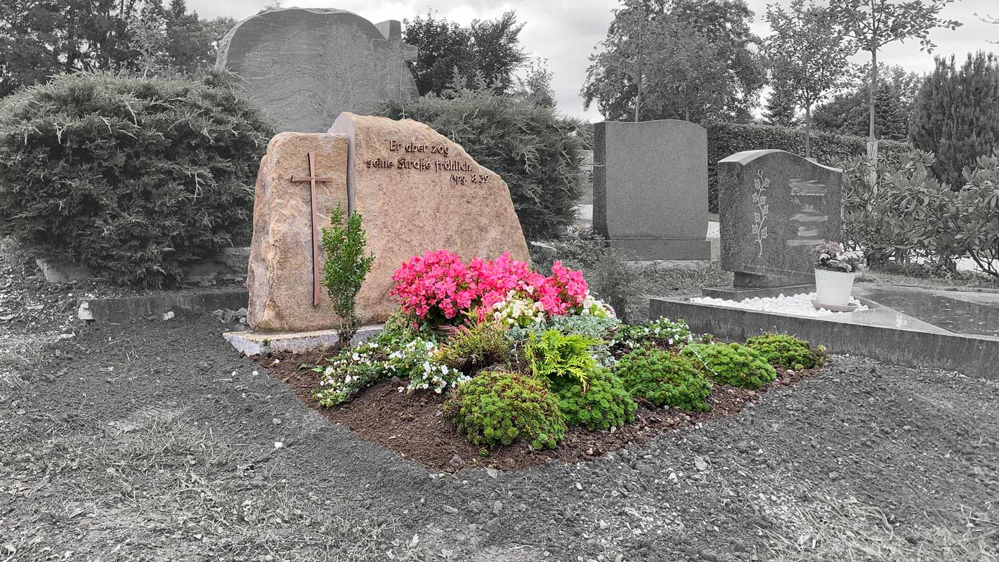 Als Steinmetzfirma mit langjährigen Erfahrungen im Grabmalbereich bieten wir Ihnen unsere Hilfe an. Lassen Sie sich beraten und ein nach Ihren Vorstellungen und der Persönlichkeit des Verstorbenen entsprechendes Grabmal fertigen. Ob in Marmor oder Granit, handwerklich gearbeitet oder hochglanzpoliert, ob als schlichter Urnenstein oder als großes Familiengrab, immer haben Sie mit uns Leute zur Hand, die ihr Handwerk verstehen. Vom ersten Beratungsgespräch bis zum Aufstellen auf dem Friedhof werden wir versuchen allen Ihren Wünschen zu entsprechen und Ihren Angehörigen ein würdiges Grabmal zu gestalten.
